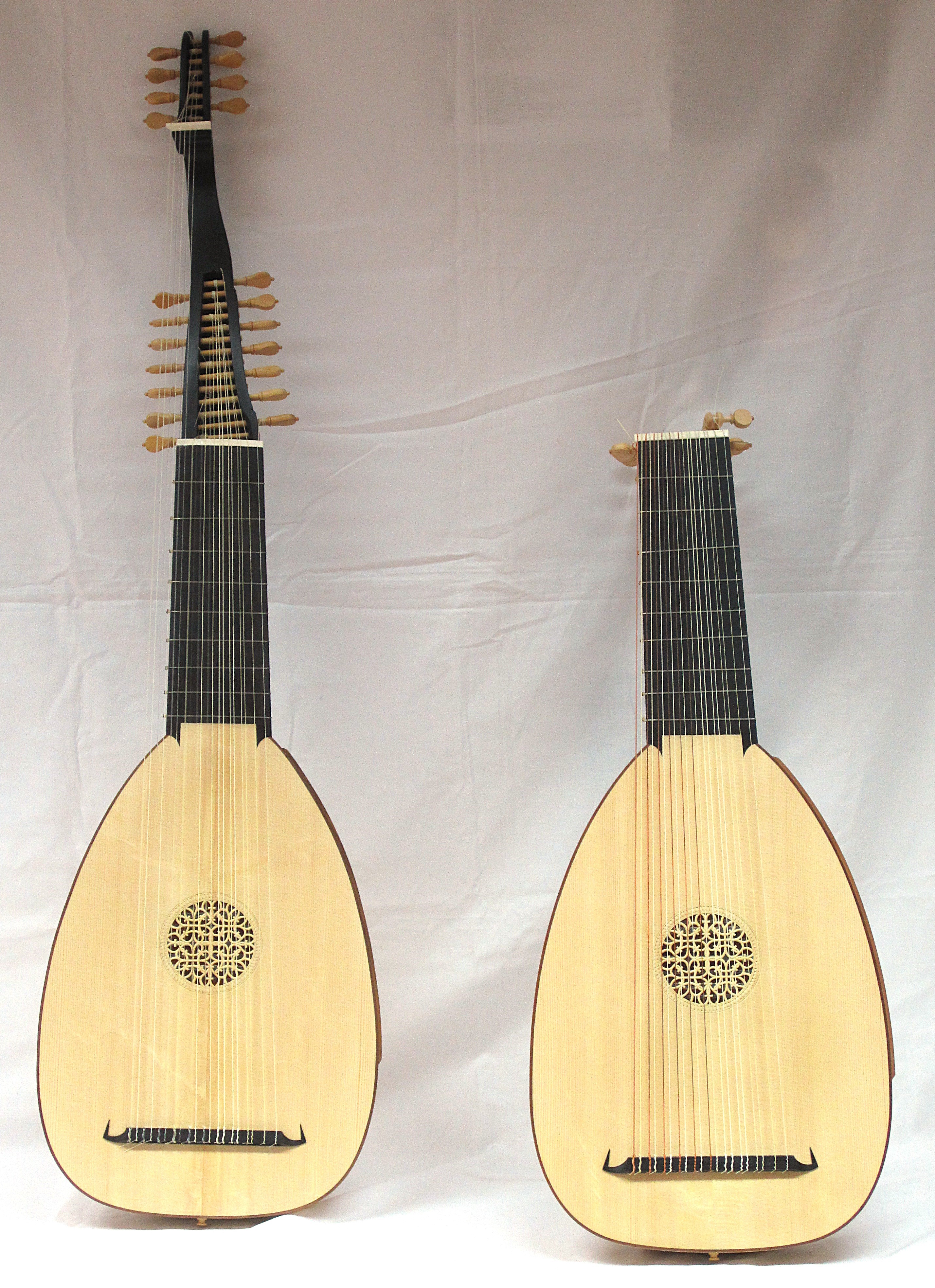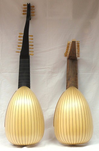 Rechts: Möglichst exakter Nachbau der originalen Knickhals Laute von Jacob Langenwalder 1627 / Umbau 11 chörig von Matthias Greimbl Kremsmünster 1678.