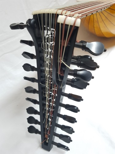 For an additional charge, the playable range of 11- and 13-course theorbo-style lutes can be extended from 8 courses to 9 courses by adding an extra pair of pegs.